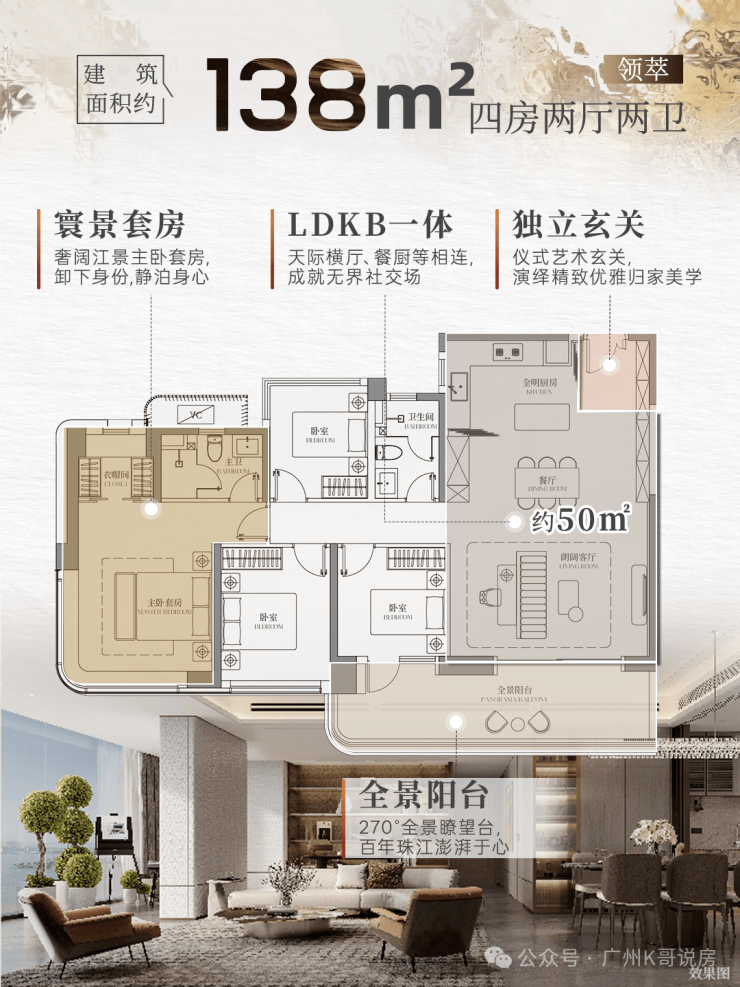 建面约138㎡户型则进一步升级,真正做到90%以上望江,更享有同等面积段的户型中最大的观江面宽。