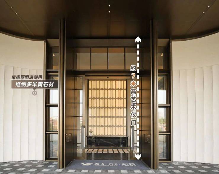 一进大门,整个入户大堂以宝格丽酒店设计风格为灵感,每一个细节都透出映射质感。约7米高的艺术移门辅以奢石弧形墙面,以强烈的仪式感,勾勒通往越秀·万博和臻的“玄关”。