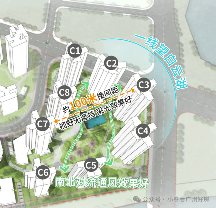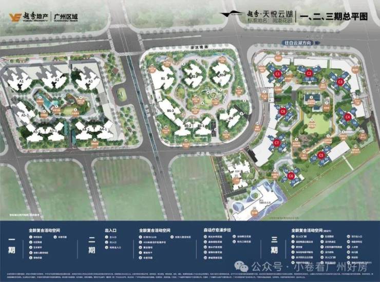 三期规划纯南向高层洋房,低密T4/T5规划,最高楼间距超100m(部分楼间距实测),选择越秀天悦云湖,选择主城区进阶生活方式。