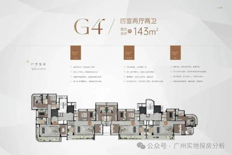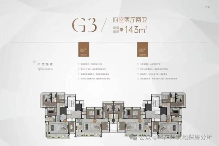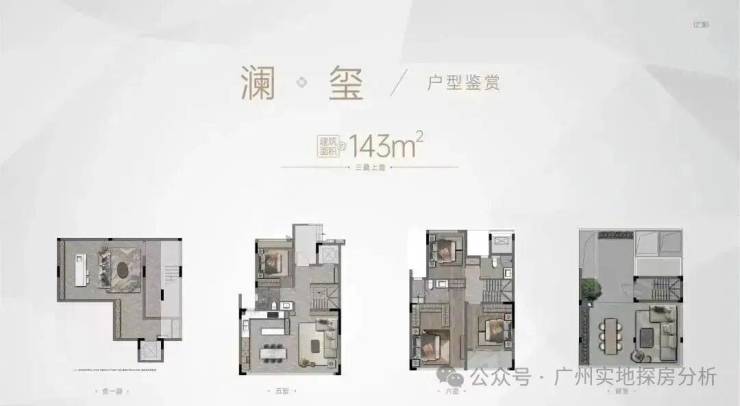 项目楼栋分布和户型:项目除了4栋R1-R4栋政府配建房以外,对外销售的产品涵盖叠墅、小高层和高层,户型建面均为143㎡。中间一线临湖区由18栋4-6层的叠墅组成一梯一户,合计188套;右侧为2栋9层高的小洋房,两梯两户,都是独门独户。同时还有4栋保障性住房,左边是2栋16-17层的小高层,两梯四户。