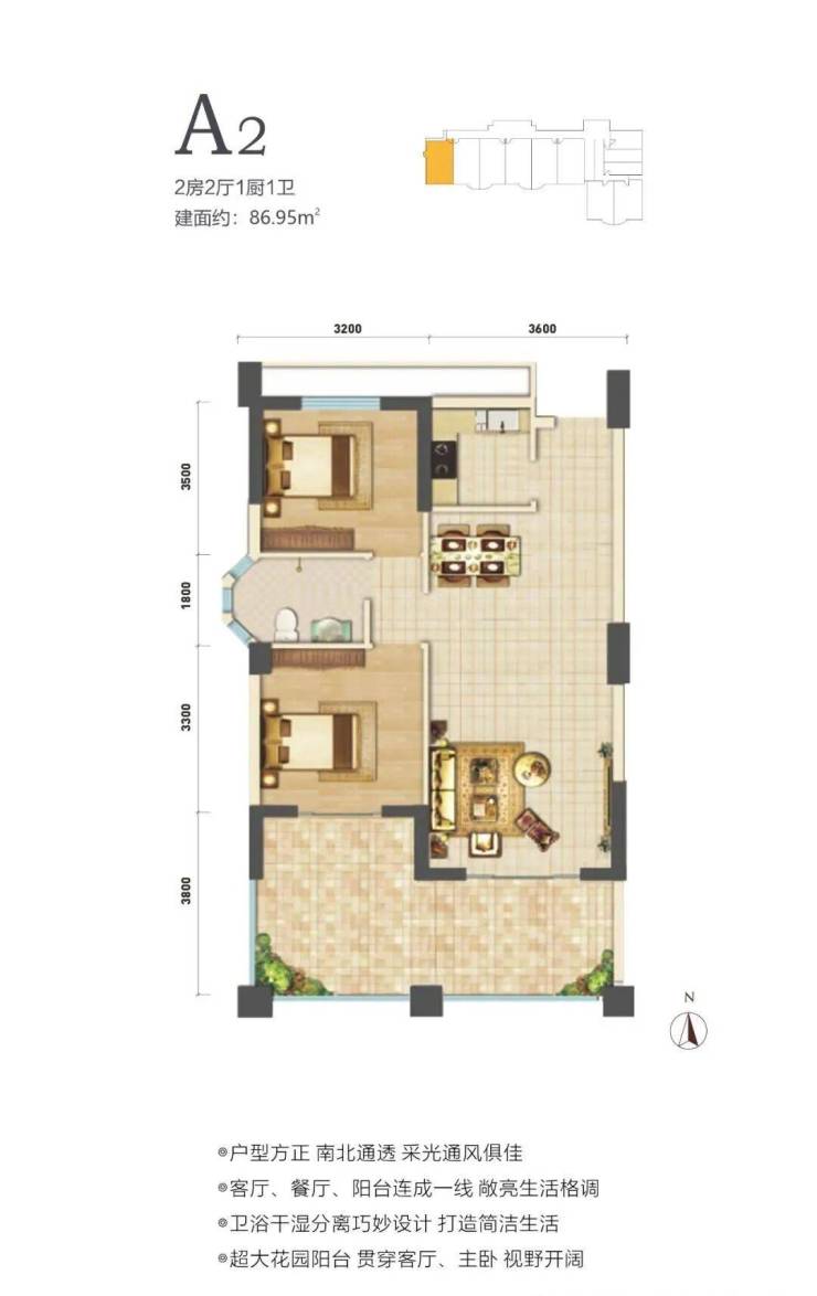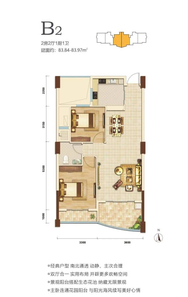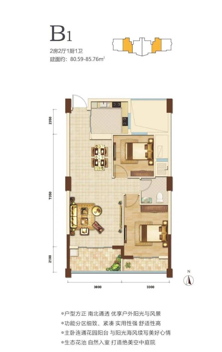 在售户型面积80-88㎡两房,户型方正,南北通透。