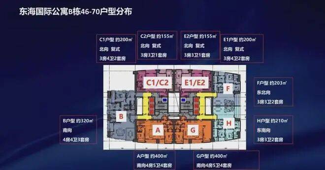 户型鉴赏:东海国际公寓建面约19万㎡,A、B两栋,户型涵盖75m²一房至800m²顶复,主力户型为140-500m²,户型面积跨度很大大,有30多个户型。