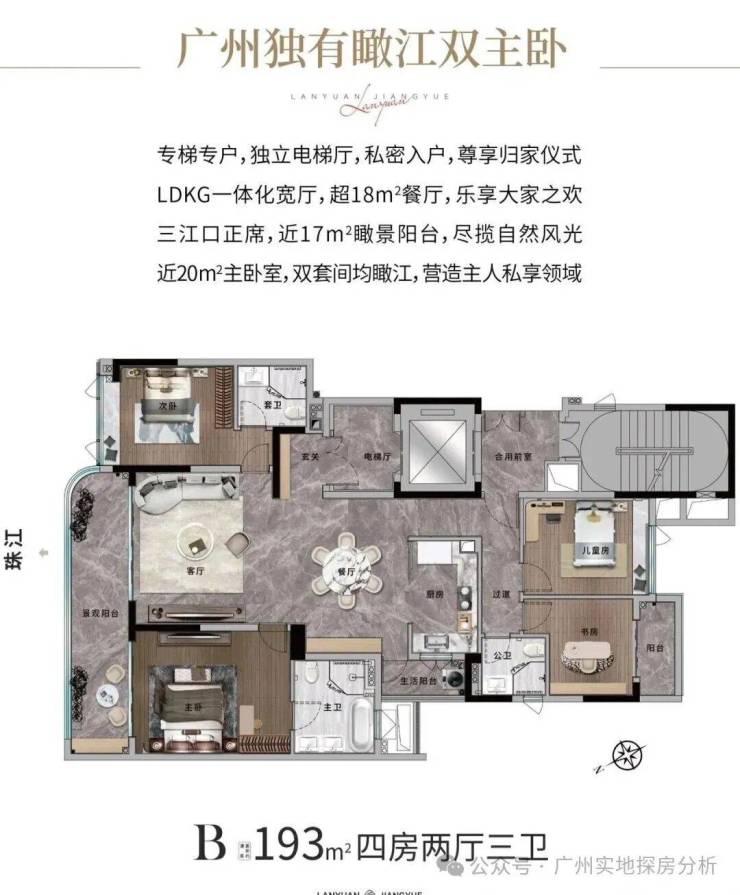 193㎡四房:LDKG一体化宽厅,双套间主卧均瞰江,近17㎡观景阳台。