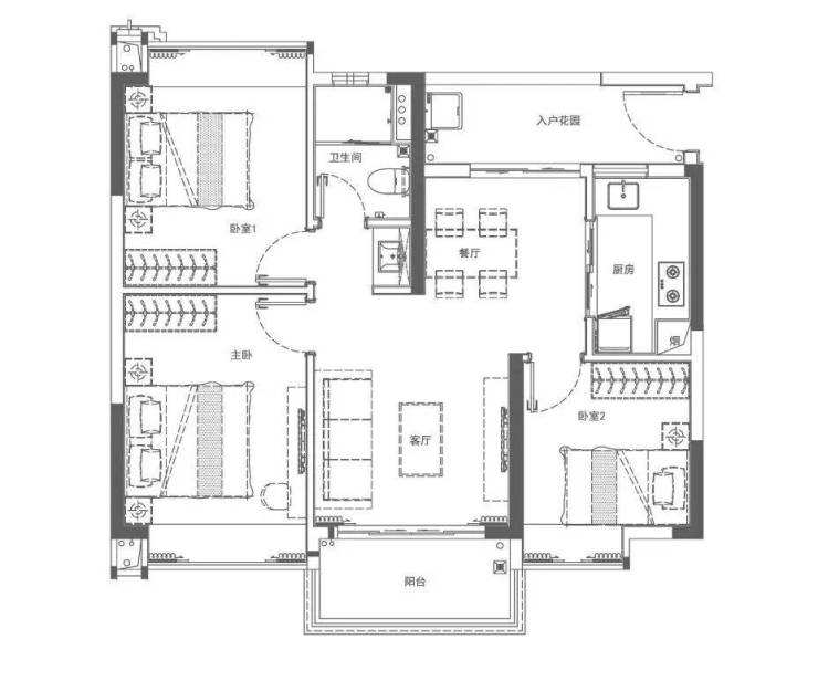 建面约86㎡南北通透三房,南北对流,采光通透,空间视野开阔,布局方正舒适实用,客厅直通南向阳台,引更多清风和阳光入室,缔造质感生活。