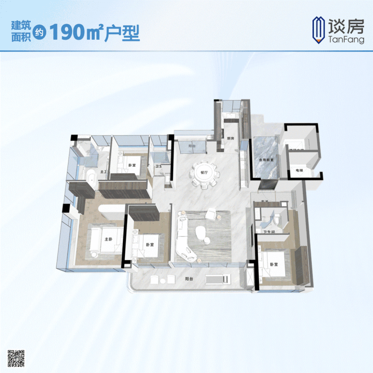 约190㎡户型,约17米南向面宽,南北对流双阳台设计,约8.9米长景观阳台。