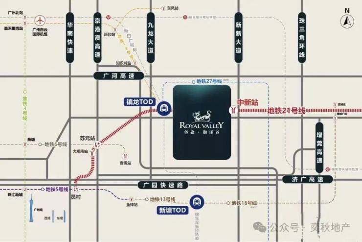 拥有四纵六横的交通网络,堪称广州东核心交通枢纽,是广州罕有的7地铁口上盖别墅物业。地处地铁21号线中新站之上,4站即达天河,1站可到镇龙TOD枢纽