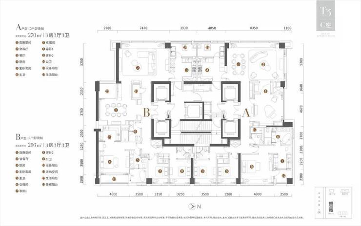 T3栋为266平和270平3房3厅3卫户型。266平主卧套房设计带有衣帽间、卫生间和景观阳台,功能齐全。次卧大小分布均衡。两个户型卧室设计均为同朝向,近40平会客厅,空间阔绰,且拥有优越的景观视野。
