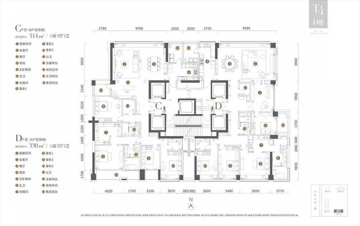 主力户型:建面约313㎡的4房2厅5卫、330㎡的4房2厅5卫