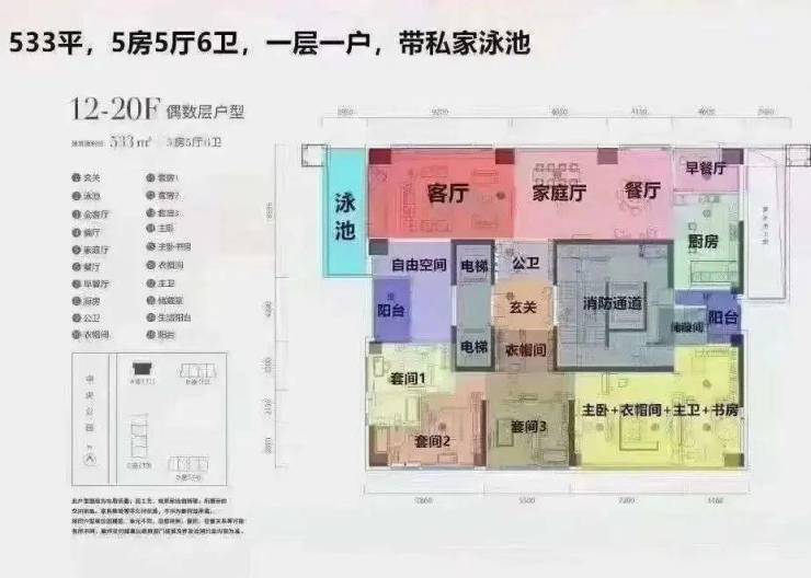 特色户型:建面约530-540㎡的顶层复式,拥有私家泳池和空中花园