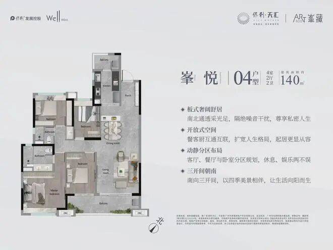 建面约 131㎡四房两厅两卫:作为改善型主力户型,空间尺度进一步升级,四开间朝南,南北对流,通风采光效果极佳;客厅面宽约 4.2 米,搭配宽景阳台,视野开阔,适合追求居住舒适度的大家庭;主卧套间配备双台盆卫浴与全景飘窗,细节处尽显高端,同时预留独立书房空间,满足居家办公或学习需求。