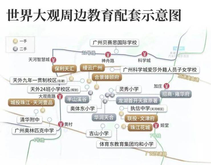 周边荟萃五大省级中学——清华附中、执信中学、天河外国语学校、广州中学、广州岭南中学(暂定名)。