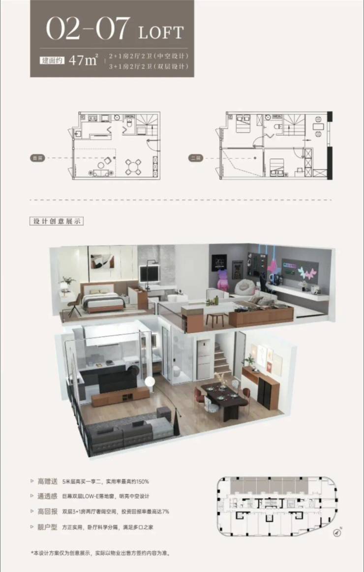 约47㎡,可设计为2+1房2厅2卫(中空设计3+1房2厅2卫(双层设计)或者复式双钥匙户型。
