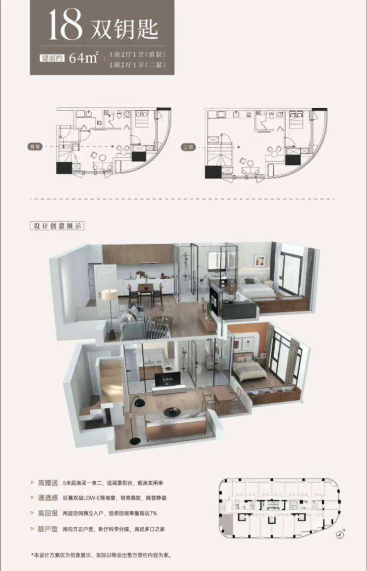 约64㎡,可设计为2+1房2厅2卫(中空设计3+1房2厅2卫(双层设计)。