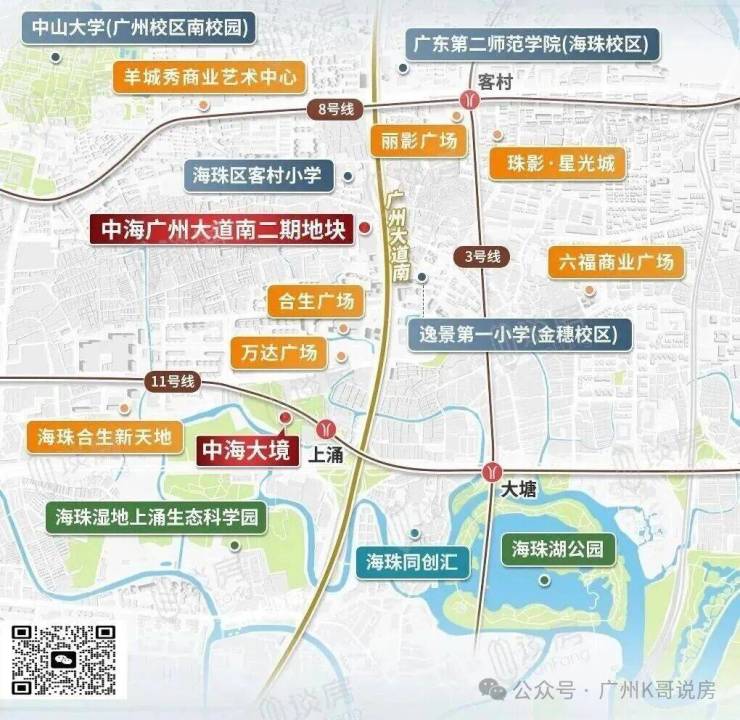 旁边现有华海九年一贯制学校,即华附海珠国际双语学校,项目西北面直线2公里就是中山大学。
