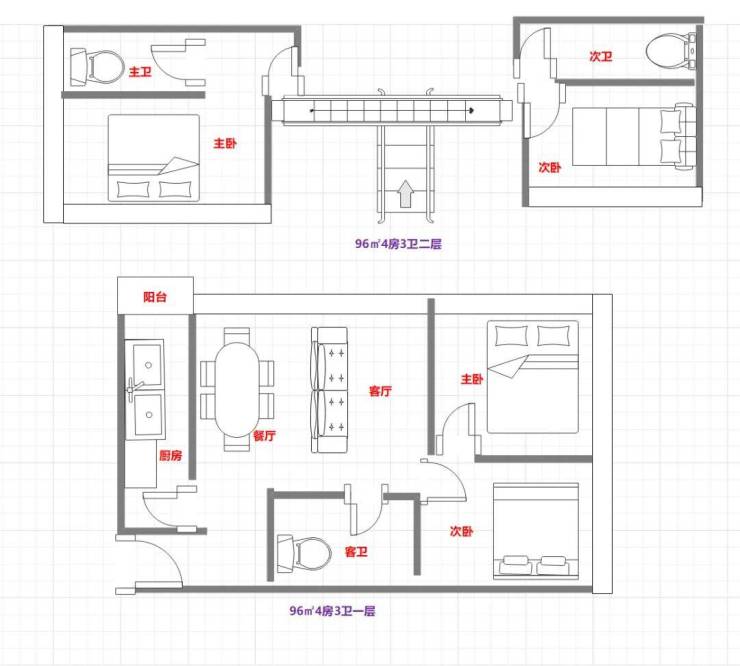 96㎡4房3卫