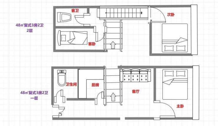 48㎡㎡3房2卫