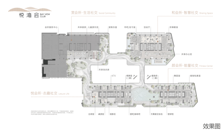 恒裕集团润悉全球精英生活方式,打造约5000m所情致主义社交CLUB-“悦湾会”,以多维空间折餐生活的理念,建均和,领,悦,增四大社交场炼,打造主题技把,共享办公,健泉中心等空问,为业主持英带来无限生活想象、
