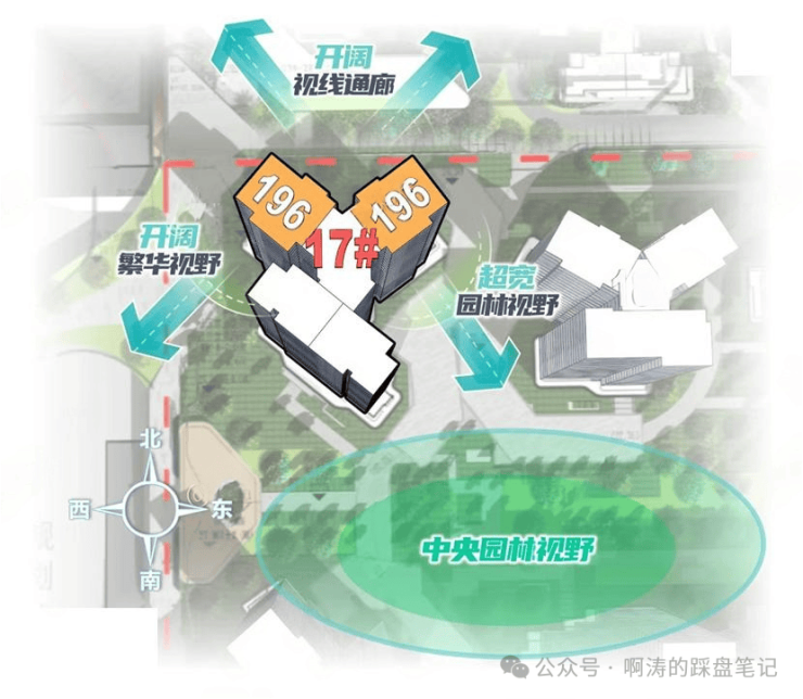 琶洲南二期围合式布局打造,8栋低密小高层,全南向排布。17#坐北朝南,3梯4户设计;