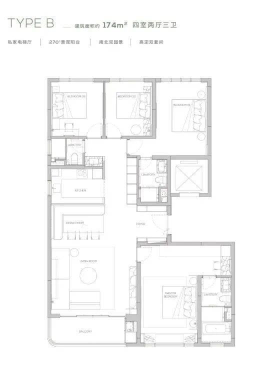 该户型采用四叶草布局,四个房间分布在户型四角,互不干扰,保障了家庭成员各自的私密性。客厅、餐厅一体化设计,空间开阔,与阳台相连,采光通风俱佳,可享受充足的自然光线和清新空气。阳台采用弧形设计,拥有 270° 环幕视野,站在阳台上,既能俯瞰社区内的园林景观,又能远眺周边的山林湖泊,将自然美景尽收眼底。