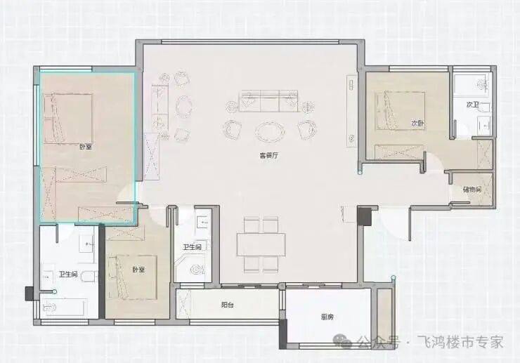 约169平方米户型的设计思路接近汇悦台,追求厅大房大,每一个房间都宽敞舒适。它仅设计为三房三卫,这种“浪费”恰恰体现了真正的奢侈不是多做房间,而是给生活留白。当然,如果需要,你也可以从客厅额外切出一个房间。