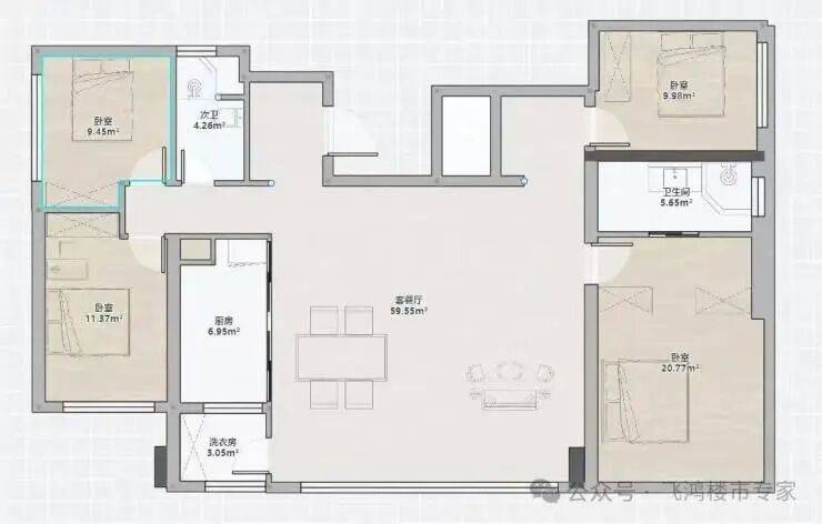 作为项目入门户型,139平方米却做出了四个正经卧室,采用“双龙抱珠”设计,四个角分布四个卧室,主套、长辈套、客厅全部望江。这种设计在保证功能性的同时,确保了每个空间都能享受到最佳景观。