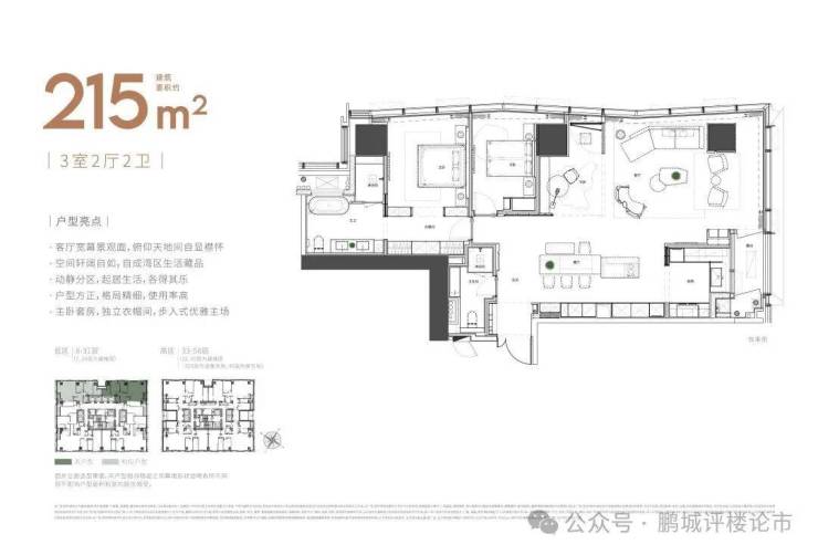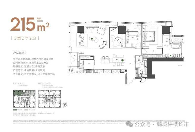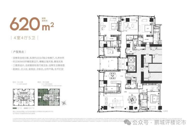 大平面大尺度定位,层高约3.6米,横厅设计确保奢阔观景面,全户型纵享环幕视野。项目打造建面约215-620㎡纯粹品质公寓,顶层为建面约1270㎡公寓产品。