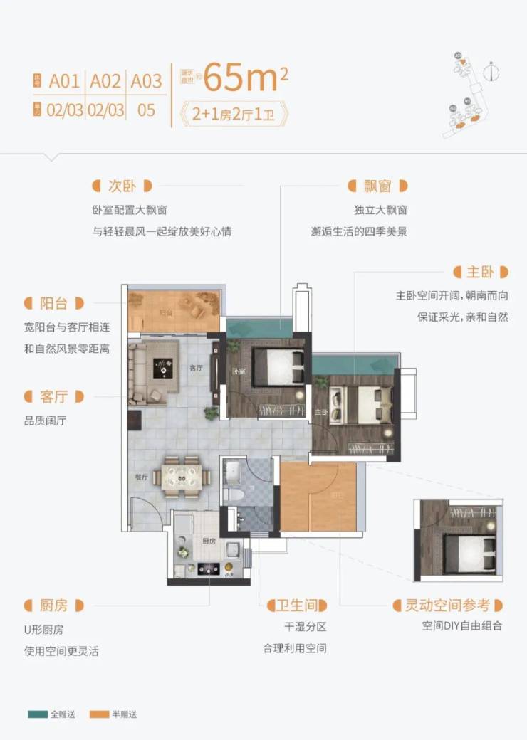 【爆款户型】建面约65㎡2+1房两厅一卫