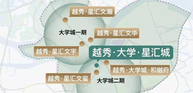 ·大学人文住宅开创者:2009年前瞻性布局大学城,打造文华、文瀚、文宇三大人文之作。在2020年,在这里开启大学城国际人文住区2.0时代,承建华南理工大学广州国际校区。陆续打造了“越秀·星汇文玺、越秀·大学·星汇城、越秀·大学城·和樾府、越秀·大学·星汇锦城”四个项目,也是对三文社区的进一步升级。