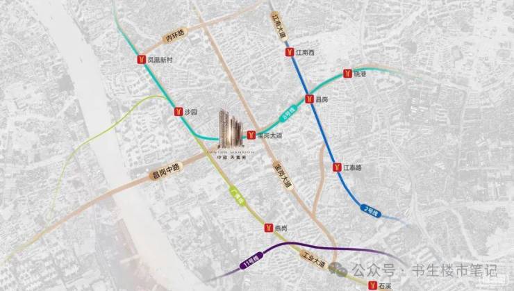 距离 8 号线宝岗大道站仅 150 米直线距离,广佛线沙园站约 700m,地铁 2 号线昌岗地铁站约1km。1站换乘广佛线,7站直达珠江新城。