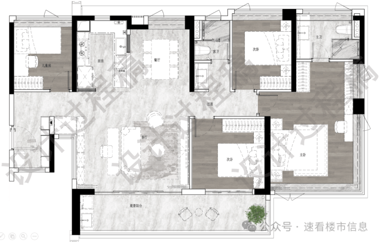 建面123平四房两卫,南北对流户型,LDKB一体化设计,约7米长景观阳台,主卧设置L型衣帽间,三个次卧差不多大小,转角玄关用作收纳。
