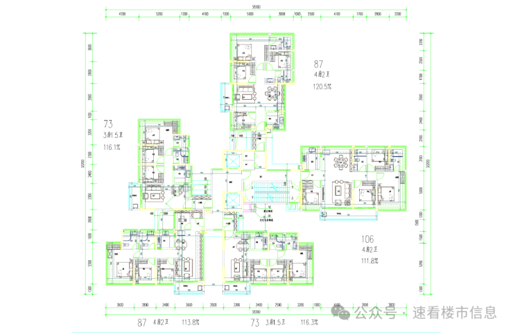 建面约106㎡四房2卫,户型使用率最低,为111.8%。作为项目最大户型,采用单边位设计,四开间朝南,配备约7米长的景观阳台,横跨客厅与次卧,视野开阔。各房间尺度更为宽裕,居住舒适度显著提升,适合预算稍高的改善型家庭。