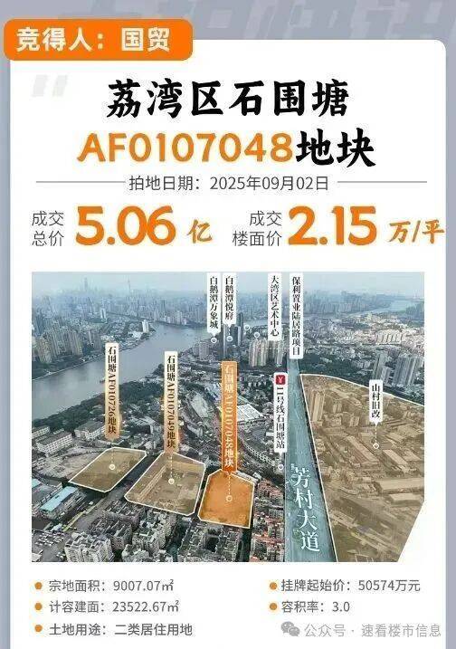 2025年9月2日荔湾区石围塘AF0107048地块竞价出让,被国贸地产以底价50574万元收入囊中,折合楼面价2.15万元/㎡。这也是国贸时隔两年多,再次在广州土拍市场拿地。