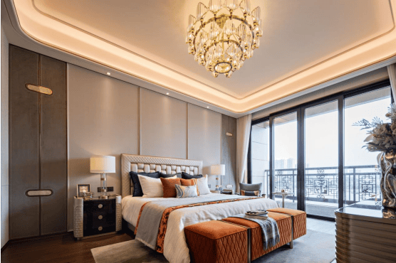 主卧墙面采取简约设计搭配拉丝不锈钢饰线元素;