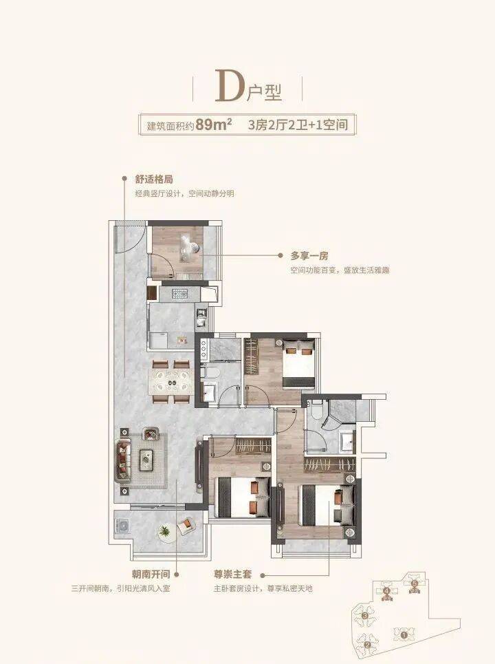 建面约89㎡3+1房空间更大一些,主卧带有私人卫浴,卧室带有多飘窗设计,双开间朝南,采光及通风不错。