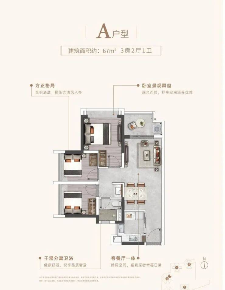建面约67㎡ | 3房2厅1卫,全明通透;揽阳光清风入怀,餐客厅一体化,全屋无暗区,主卧还带景观飘窗。同等面积多一房,也是非常极致了。而且对于年轻人来说,上车门槛超低。
