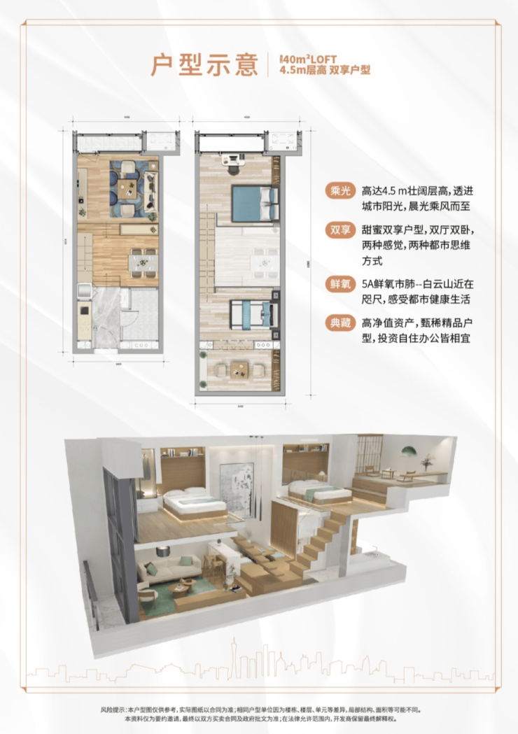 户型产品亮点:项目主打31-57㎡灵动户型,以40㎡为主力面积段,涵盖一房、两房格局,提供3.4米平层、3.6米及4.5米复式三种层高选择,精准适配刚需自住、商务办公及过渡性居住需求。4.5米层高复式户型采用中空挑高设计,可灵活打造双层空间,实现“一房双用”,空间利用率极高,营造媲美大户型的居住体验。全系户型遵循南北通透理念,搭配大面积落地窗,最大化引入自然光线,室内布局合理,兼顾收纳功能与居住舒适度,满足多元场景使用需求。搜狐用户专属福利:拨打400-898-8805预约看房,可优先品鉴核心户型,享专属产品解读服务。