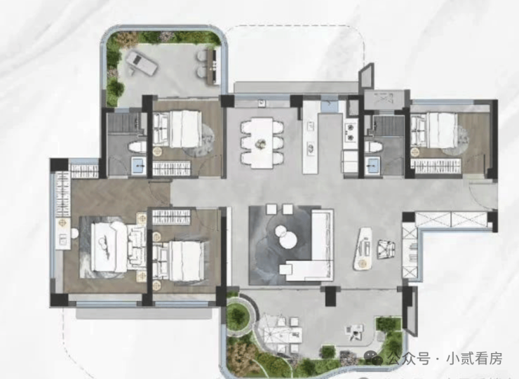 该户型把赠送面积都给了工区和主卧,全屋做到4+1房,空中花园连通公区,面积达到73㎡。最牛的是,主卧还带约14㎡的空中花园,打造一个私享庭院。