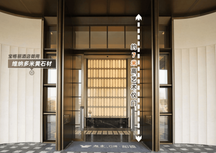 项目共规划约7.2万㎡超级中央园林,目前已开放实景园林。入户大堂以宝格丽酒店设计风格为灵感,搭配约7米高的艺术移门和奢石弧形墙面,高级感满满。