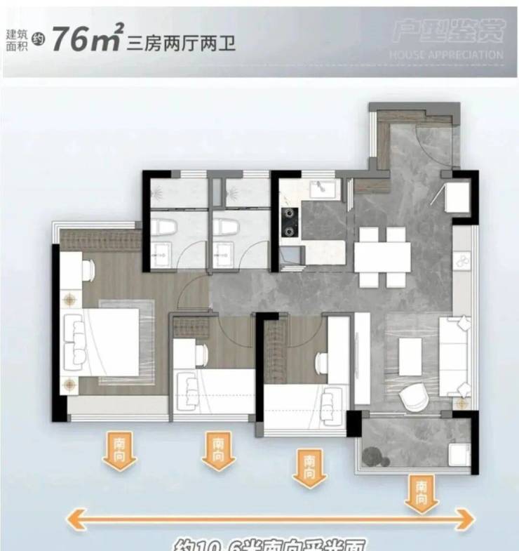 76㎡三空间两卫,年轻人主城上车首选 ,四开间朝南 全明转角玄关 开放式厨房,开阔景观阳台 南北对流主套&衣帽间。