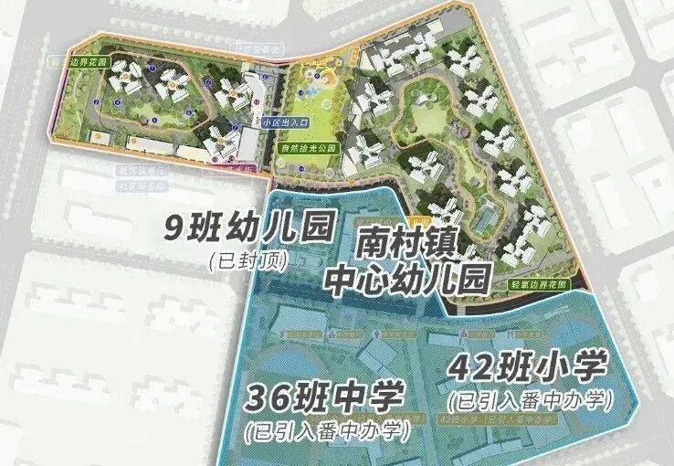 配建了一所42班小学和36班初中,总提供3600个学位,该项目已成功引进公办名校番禺中学进行办学,预计2025年9月就能开学。