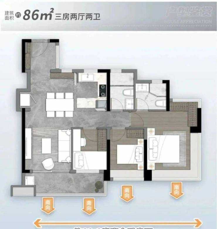 86㎡三空间两卫,三口之家一步到位,一期断货王PLUS 南向4开间 约11.1m采光,双进私密玄关 5.4m跑道式阳台,主卧270°无立柱景观飘窗 阳光衣帽间 。