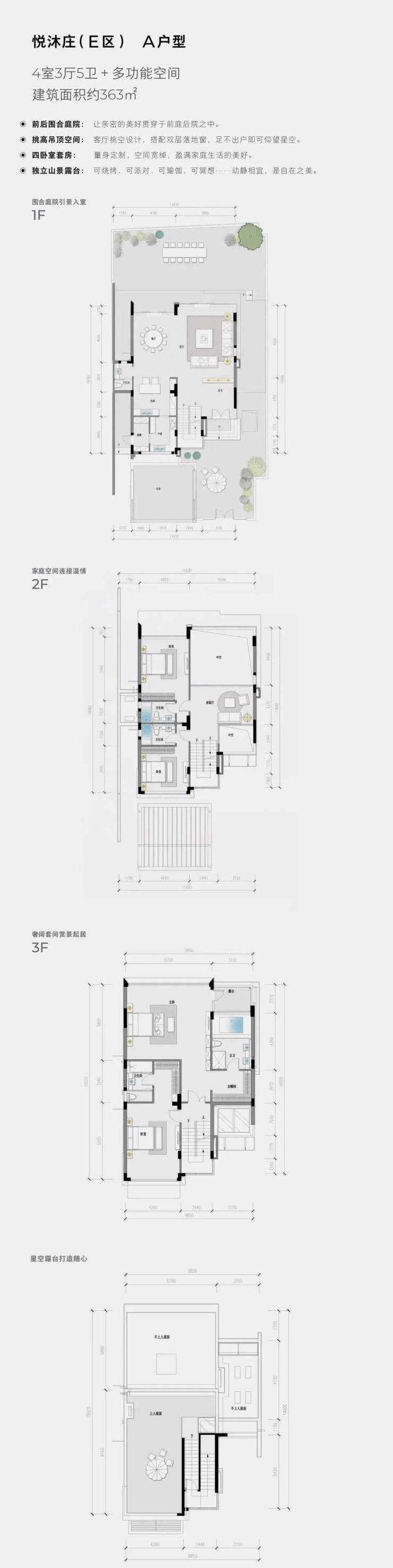 ✮产品面积:A户型(首层)195方-3房3厅4卫,B户型(二层)240方-3房3厅4卫,D户型(顶层)175方-3房3厅4卫,E户型(山景平层)170方-3房2厅3卫