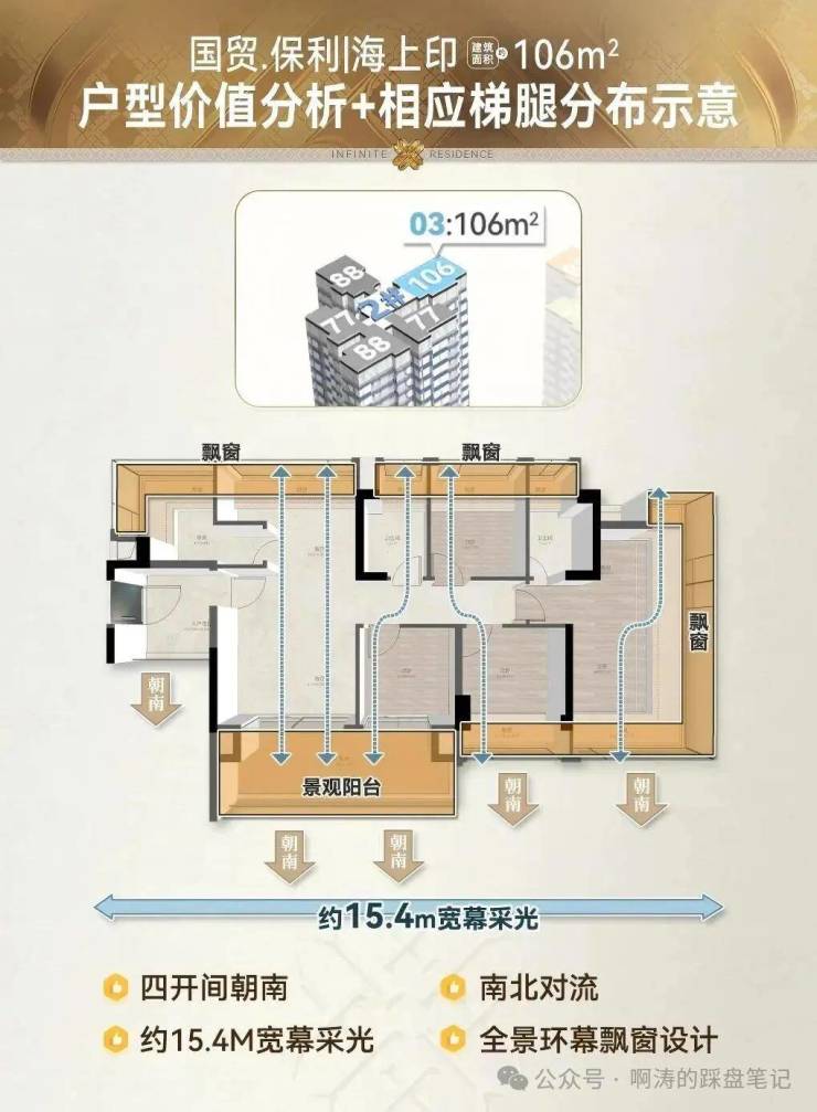 建面约106㎡户型,全屋超核南向资源,打造约57㎡一体化对流通厅、约26㎡环幕主套,拿出全维超越同级的居住享受。