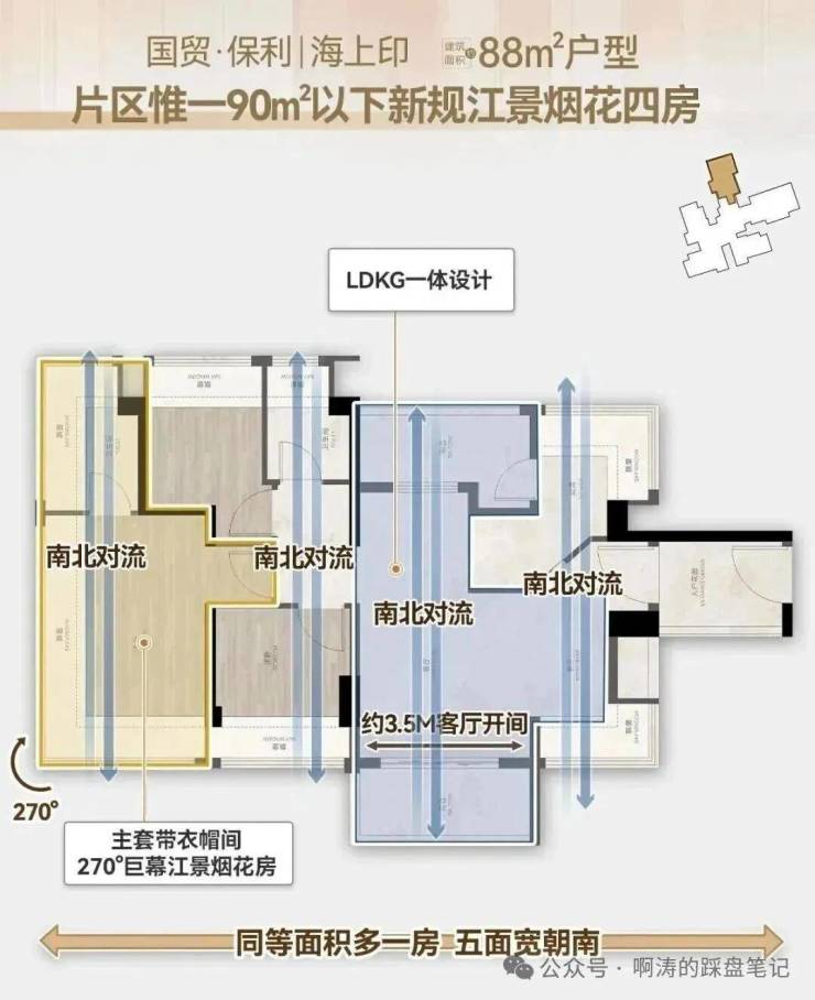 建面约88㎡户型,南向对流五开间,实现2-4空间可变式布局。更享跨代际新规得房率,比同等建面的三代宅多出一个大次卧,比二代宅多出一个客厅。