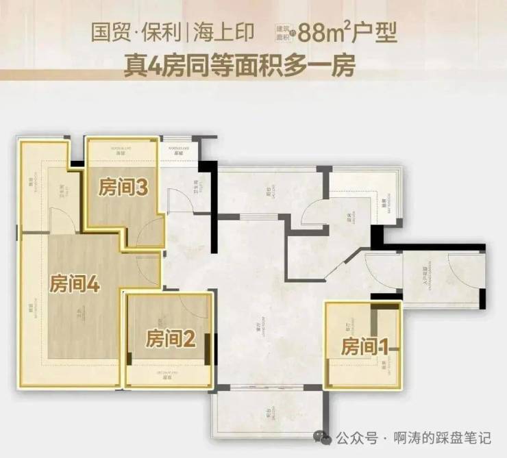 88㎡ 4房2卫: 把四房门槛卷到了90平以内,还是南北对流的单边位!