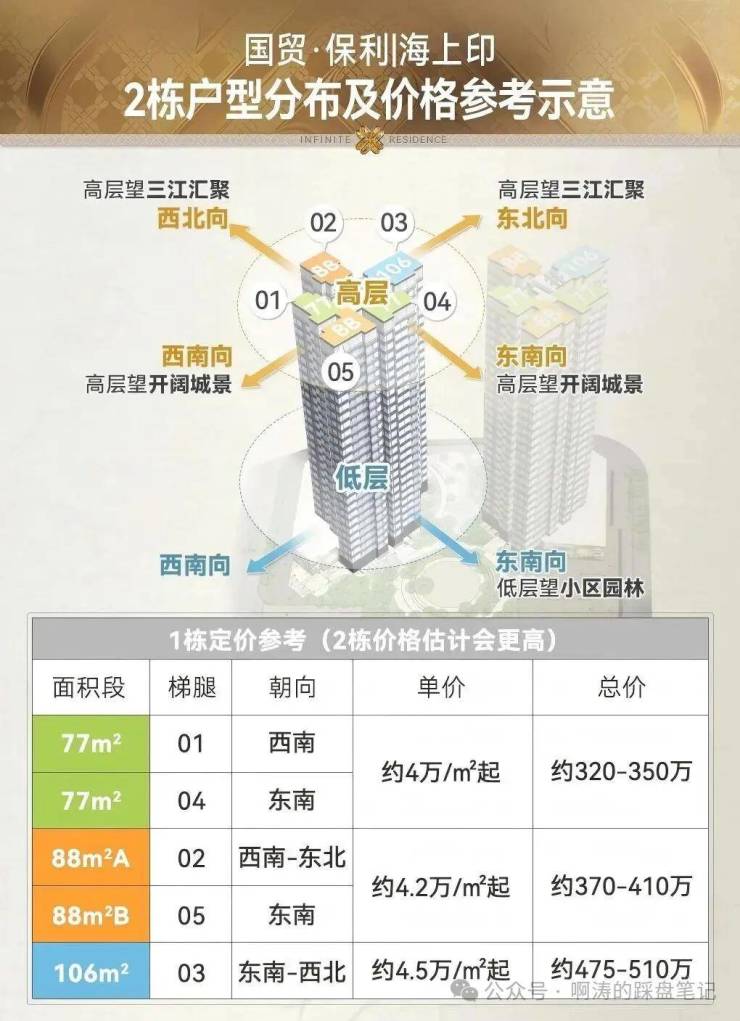 西南向价格最低,约320万起。东南向主卧可望江,中间楼层4万出头,顶楼接近4.3万,近330万。