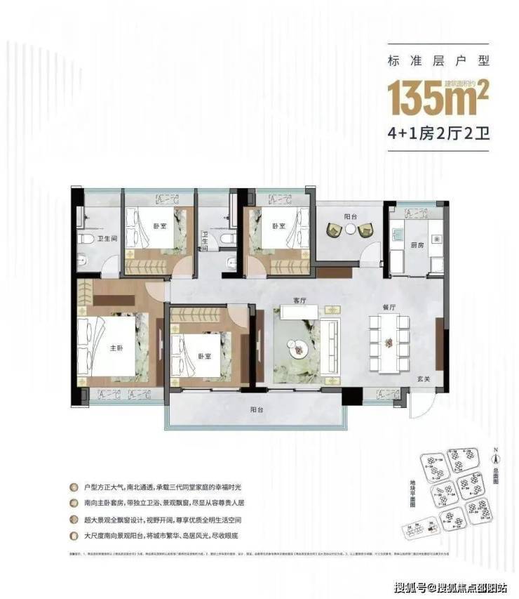 而135㎡户型为横厅设计,南向景观大阳台贯通客厅与次卧,加上主卧、餐厅形成4开间朝南。