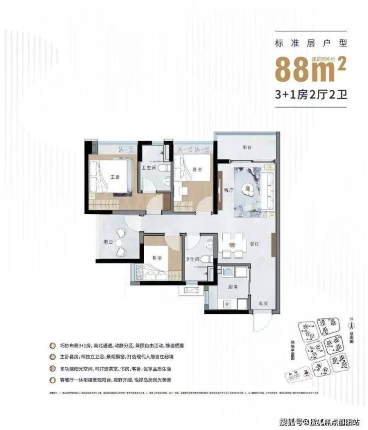 88㎡不仅做到3+1房,而且主卧还做了宽敞的套房设计,主人居住隐私性大大加强。而功能区的+1房,更增添了户型的可变性,可作为书房,玩具房,影音房、儿童房,当然你也可以改造为衣帽间,满足不同家庭成员的使用需求。
