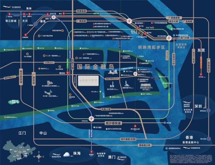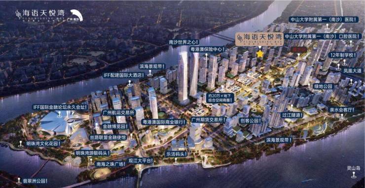 项目东侧为IFF国际金融论坛、广交所、南沙世界之心、金融创新中心等地标性建筑为代表的金融地标集群,与项目“147米”高度住宅地标,遥相呼应。