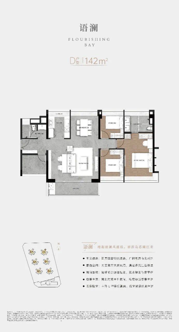 D户型:建筑面积约142㎡,约46㎡客餐厨空间,约26㎡南北对流主卧套房,4开间朝南,约14.5米南向采光面。